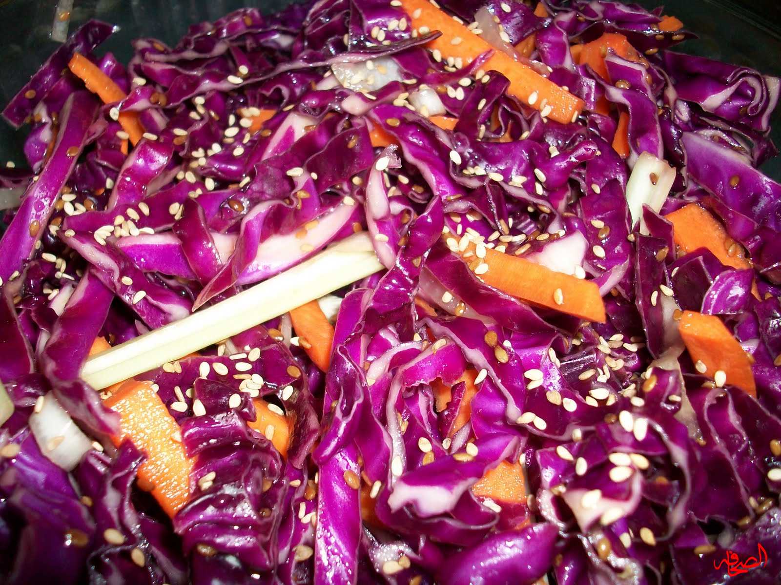 قطعي الملفوف الى شرائط رفيعة. ابرشي الجزر. وافرمي الكزبرة. اخلطي الخضار اعلاه مع اضافة الزيت الحامض والثوم ثم الملح والبهار.