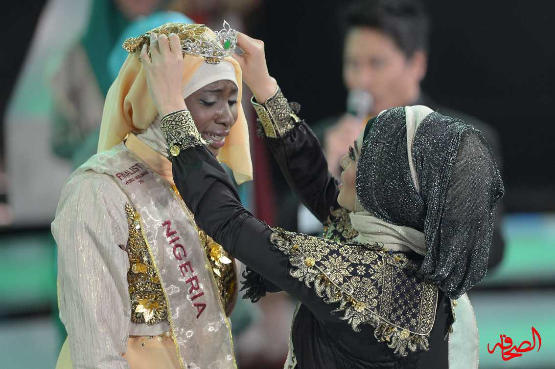 اختال صف من الفتيات المحجبات يرتدين ملابس فضفاضة ملونة على ممر في العاصمة الاندونيسية جاكرتا أثناء المرحلة النهائية من مسابقة ملكة جمال المسلمات والتي حصدت اللقب فيها النيجيرية أوبابي عائشة أجيبولا.
