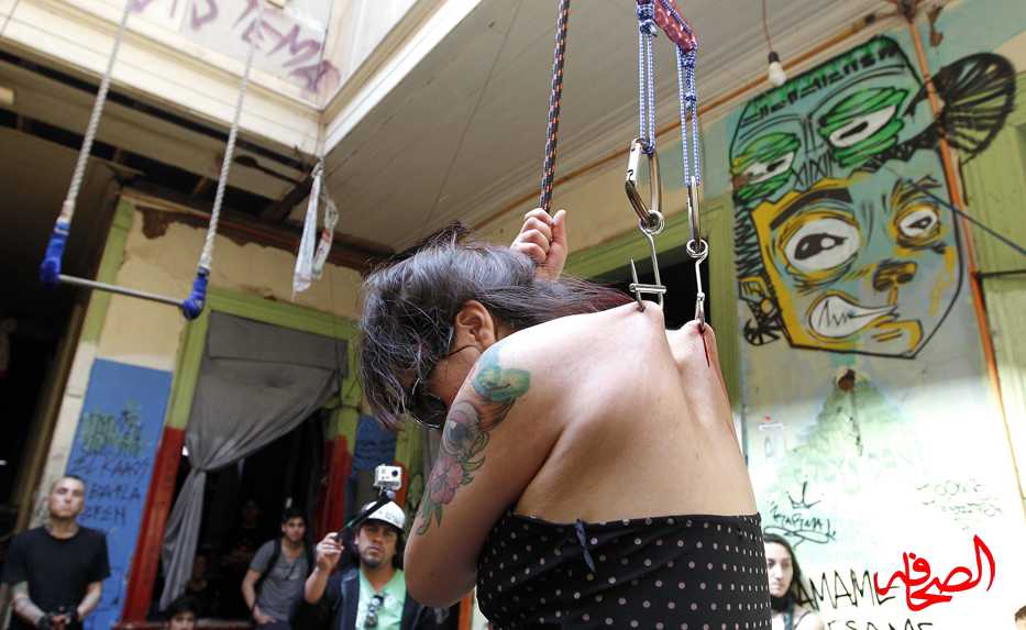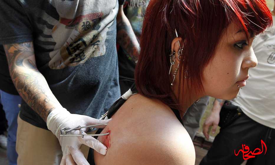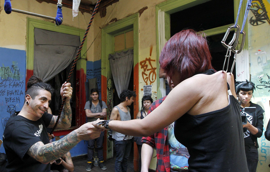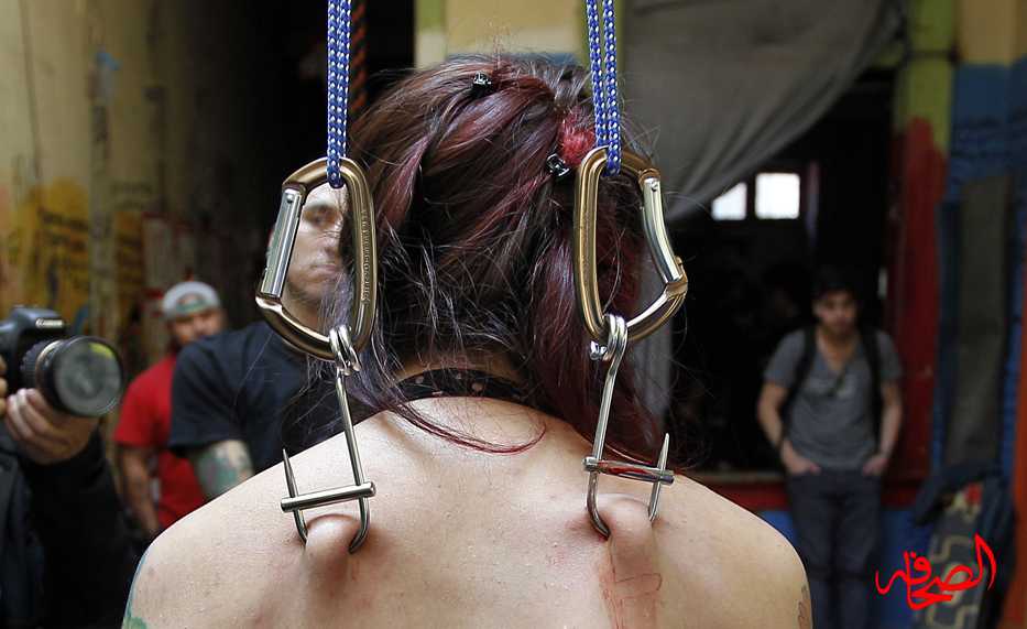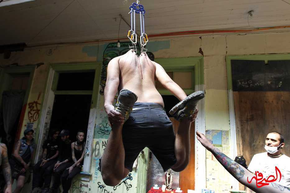 علق عدد من الرجال والسيدات أنفسهم بسنانير مغروسة في الجلد، وذلك خلال "مهرجان الوشم" بمدينة فالبارايسو، التي تبعد  121 كيلومترا (75 ميلا) شمال غرب سانتياجو في تشيلي ، أول من أمس.