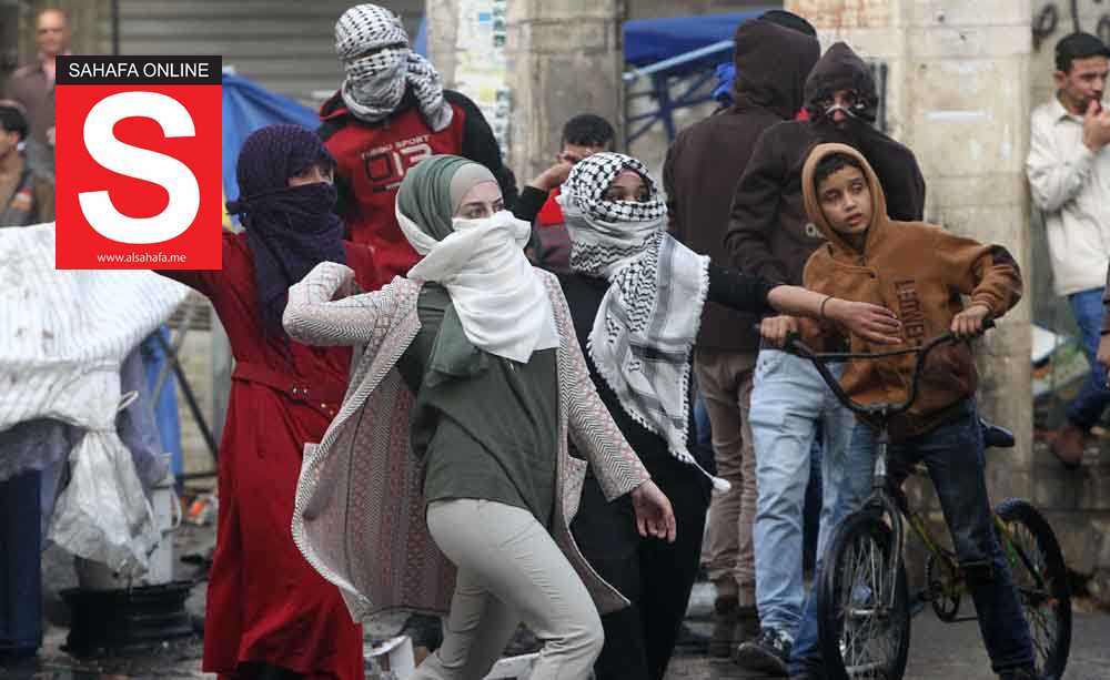 تشارك فلسطينيات تلثمن بالكوفيات في رشق الجنود الاسرائيليين بالحجارة مطلقات الهتافات ومؤكدات ان "الوطن ليس ملكا للشباب فقط!"