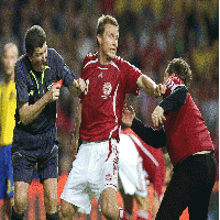 ألزم اتحاد كرة القدم في الدنمارك أمس أحد المشجعين بدفع 87ر1 مليون كرونة (309 ألف دولار) للاتحاد كتعويض بسبب اقتحامه أرض الملعب وتسببه في وقف مباراة المنتخبين الدنماركي والسويدي في التصفيات المؤهلة لنهائيات كأس الأمم الأوروبية الماضية (يورو 2008).