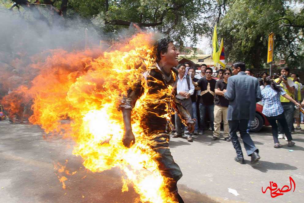 على غرار محمد البوعزيزي المواطن التونسي الذي أحرق نفسه بعد تعرضه لصفعة من شرطية، وفجر بذلك الثورة التونسية، مات متظاهر تبتي في نيودلهي بعد أن أحرق نفسه خلال احتجاج على زيارة مقررة للرئيس الصيني هو جينتاو للهند.