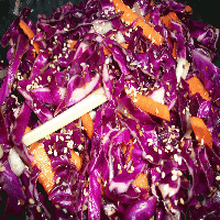 المقادير:١ ملفوف/ كرمب احمر٢ جزر كبيرة١/٢ باقة كزبرة خضراء١ ليمونة حامضة١ فص ثوم١ ١/٢ ملعقة كبيرة زيت زيتونبهار اسودملحطريقة التحضير:قطعي الملفوف الى شرائط رفيعة. ابرشي الجزر. وافرمي الكزبرة. اخلطي الخضار اعلاه مع اضافة الزي ...