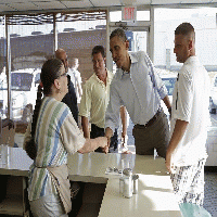 وزار أوباما مطعم "بليس إن أكرون" الذي تملكه "آن هاريس" في حوالي الساعة الثامنة صباحاً بالتوقيت المحلي "1200 بتوقيت غرينتش"، من صباح أمس، أثناء جولته الانتخابية التي يقوم بها على مدار يومين بواسطة في ولايتي أوهايو وبنسلفانيا، وتناول أوباما الإفطار وتحدث إلى هاريس وأسرتها، ووقف لالتقاط صور معهم، وعانق صاحبة المطعم.