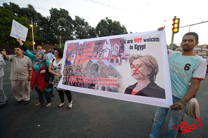 وردد محتجون خارج الفندق الذي كانت تقيم به كلينتون مساء يوم السبت هتافات مناهضة للاسلاميين متهمين الولايات المتحدة بدعم صعود الاخوان المسلمين الى السلطة.