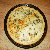 اخرجي العجين من البراد وبعد ان يدفأ قليلاً مديه وافرديه في صينية الخبز. اتركي الاطراف عالية واسكبي الفطر فوق العجين. اخفقي بيضة واحدة اضيفي لها الكريمة او الحليب اسكبي المزيج فوق الفطر. رشي الجبن و الحبق وضعيه في الفرن ٣٠ دقيقة او حتى تنضج.