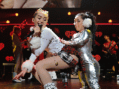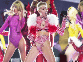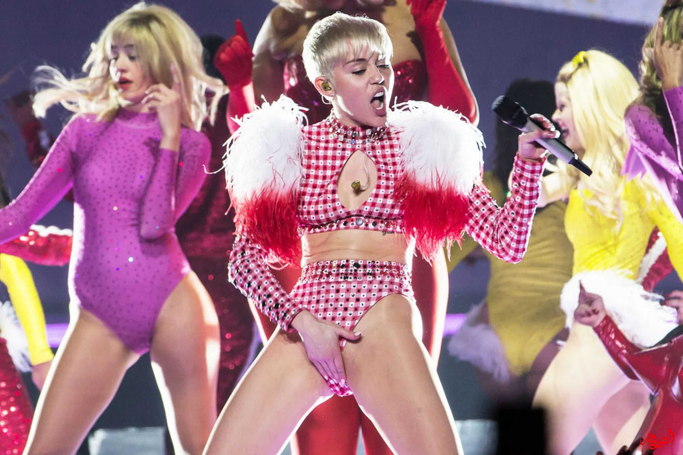 ظهرت مايلي في حفلها الأخير الذي تم مؤخرًا في لوس أنجلوس، بأزياء فاضحة، وقامت  بلمس أماكن حساسة من جسدها، ونادت على  النجمة كاتي بيري التي كانت جالسة في الصف الأول من الحضور وتبادلت معها قبلة علنية حارة.