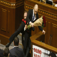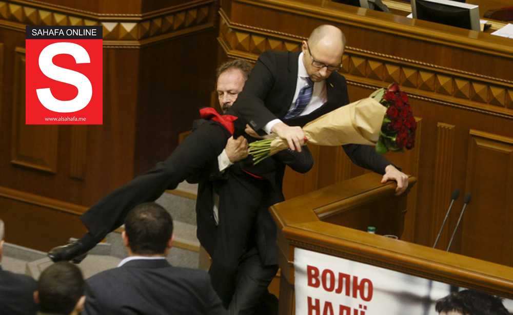 تعرض رئيس الوزراء الأوكراني ارسيني ياتسينيوك لمحاولة اعتداء داخل قبة البرلمان بعد أن قام نائب من كتلة رئيس البلاد بيترو بوروشينكو بتقديم باقة ورود له ثم سرعان ما حاول حمله بالقوة ليندلع بعدها شجار عنيف وعراك بالايدي بين عدد من النواب المؤيدين والمعارضين لهذا التصرف.