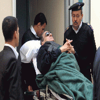 ووضع مبارك (83 عاما) الذي كان يرتدي نظارات شمسية، على سرير نقال لدى إخراجه من سيارة الإسعاف لإدخاله إلى قاعة المحاكمة، كما جرى في الجلسات السابقة من هذه المحاكمة التي استؤنفت في 28 ديسمبر بعد توقف استمر ثلاثة أشهر.