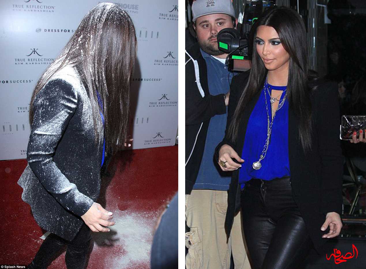 كارداشيان تعرضت للحرج الشديد عندما وجدت نفسها فجأة غارقة في الدقيق بعد الهجوم الذي تعرضت له من السيدة التي واصلت رش الدقيق على رأسها حتى غطت وجهها وشعرها وملابسها قبل أن يتدخل مسؤولون ليأخذوا النجمة بعيدا عن عدسات المصورين التي سجلت الواقعة صوتا وصورة.